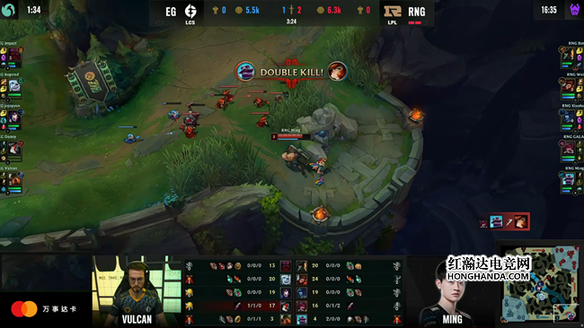 EG中野辅三人卡视野悄悄摸进RNG野区,正好蹲到刚刚坐飞门出来的布隆,然而千载幽咽和魅惑妖术全部放空,布隆利用秒表拖住了关键的时间,RNG大部队形成一波超大范围反包夹,逐个绞杀带走EG四人!23分钟RNG野辅在河道遭遇EG伏击,猴子首先阵亡,EG选择直接赌一波大龙,RNG四人的配合出现许多瑕疵变成葫芦娃救爷爷,结果是让EG在落后接近9千的情况下打出0换5并且拿到了大龙。两边的经济差距一下子缩小到3千不到。