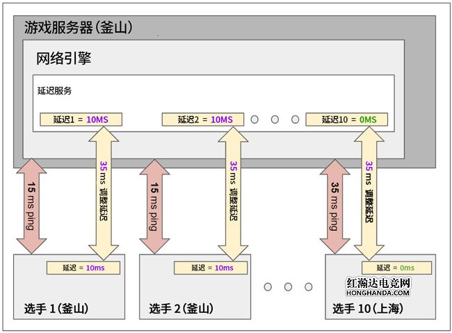 上图显示了系统的各个组件。图片顶部是游戏服务器组件,底部是游戏客户端(选手的电脑)。在目前这种情况下,延迟服务的目标延迟值为35ms。图中的红色箭头表示存在的实际网络延迟。正如所看到的,釜山的选手1和选手2显示为15ms的“真实”ping值,而上海的选手10显示为35ms的ping值。黄色框表示在客户端和服务器端人为添加了多少延迟。在这种情况下,选手1和选手2分别向客户端和服务器端添加了10ms的延迟,达到了目标延迟35ms。选手10已经具有等于目标延迟35ms的实际延迟,因此没有添加延迟(0ms)。