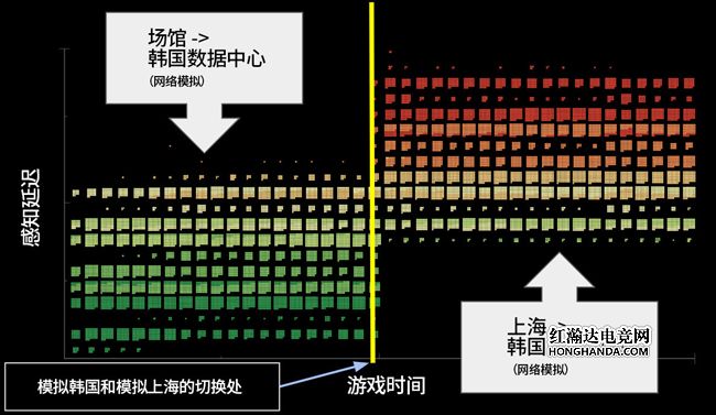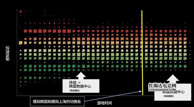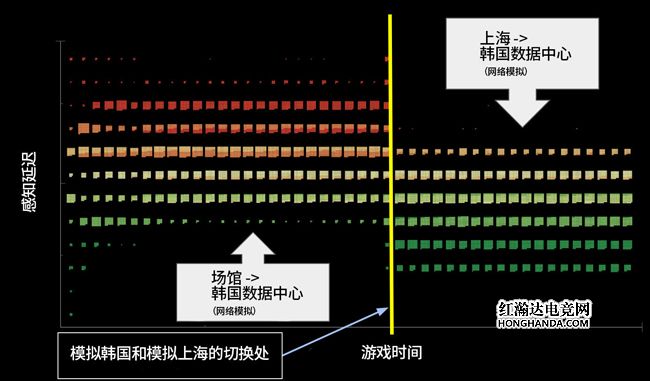 我们意识到,在场馆内的选手之前都是在高于35ms范围的网络下进行比赛的,但在上海远程参赛的队伍,却是在实际的35ms范围内进行比赛的——35ms左右是釜山至上海的自然网络延迟。我们没有做到公平竞争原则下的延迟对等。
