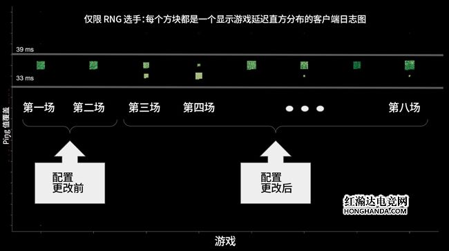 上图只显示了RNG相关的比赛,竖轴是显示的ping值。与上一个部分显示数据的图表不同,在这种情况下,横轴代表离散的数据集,每个游戏都有一个数据集。因此,每个绿色方块都是报告的ping值的直方图,这些都是从客户端日志中读取一个选手的一场比赛的数据。正如这里可以看到的,这些值存在一些波动,并且值都在33ms和39ms之间的范围内。这符合RNG的35ms+/-5ms的已知自然延迟值。