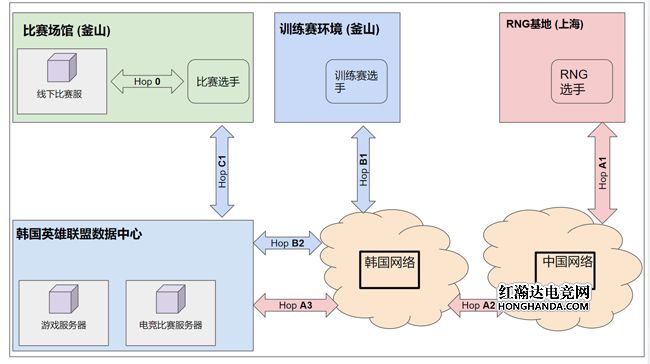 该方案建议,远程参赛队可自行选择所拥有的最快速网络,直连到季中冠军赛比赛服务器。这意味着现场参赛队伍会在低ping值(~15ms)下比赛,而远程参赛队伍(以RNG为例)则要在其自然延迟下比赛。从中国连接到釜山的自然延迟约为35ms。