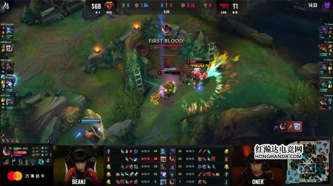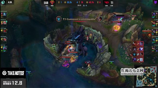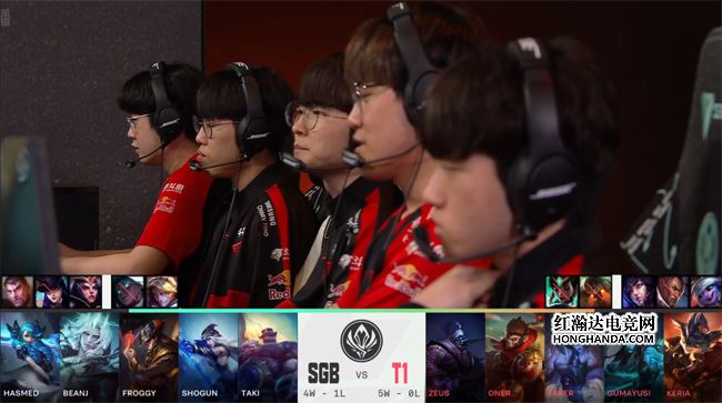 没有了中路一塔的庇佑,艾希在中路清线时直接被兰博的远程大招留下,T1将其带走再拔中路二塔,减员的SGB无奈放掉第二只先锋。大龙出生后SGB下路水晶失守,卡牌开大发现T1在抱团打小龙,选择孤注一掷rush大龙,可是T1迅速赶到大龙坑,打出0换4接盘了大龙,直指中路一波结束比赛,双杀SGB锁定了A组第一,作为继G2、RNG之后第三支小组赛六战全胜的队伍晋级对抗赛!自此本届MSI对抗赛阶段的六强集结完毕:T1、越南赛区SGB、RNG、东南亚赛区PSG、欧洲赛区G2、北美赛区EG将在北京时间5月20日正面对决冲击四强!