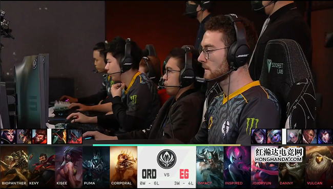半血的阿卡丽没有及时回城补血,结果吃到刀妹比翼双刃遭到对位单杀送出一血,接下来EG各条路全线开花开始疯狂收割人头,在对线期就建立了巨大优势,ORD被迫把阿卡丽换到上路,结果鳄鱼也被刀妹单杀,比赛局势已经完全失去了ORD的掌控。已经六战全胜的ORD似乎已经失去了斗志,任由EG肆无忌惮地发起进攻收割人头,仅仅14分钟双方击杀比已经达到了12:0。