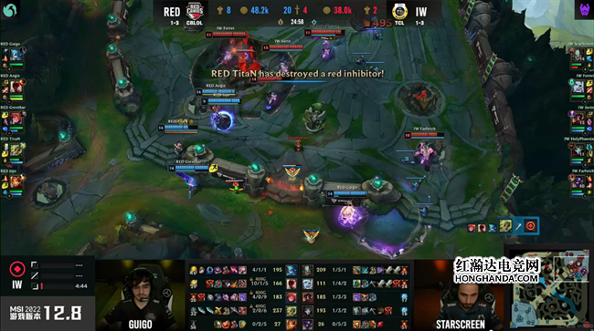 26分钟RED通过大龙逼团再度击溃IW,随后拆掉IW最后一路高地并且试图结束比赛,IW绝境防守,RED一路追杀到泉水和对方打成了4换4,复活出来的牛头和烬逼退盲僧守住了基地。RED队员复活以后卷土重来完成最后一次进攻,IW终究没能更进一步倒在了RED手中,成为2022 MSI季中冠军赛首支遭到淘汰的队伍。