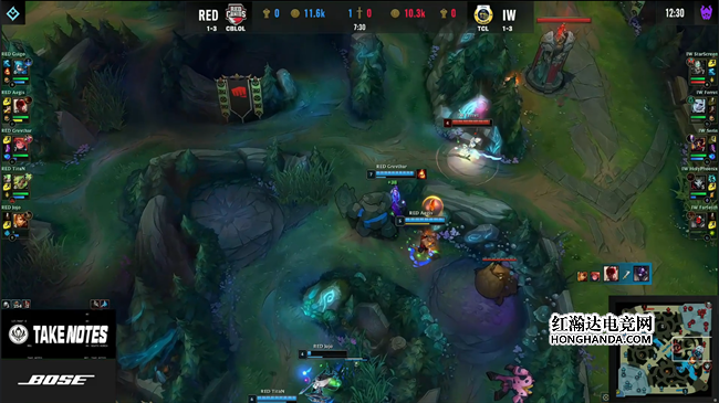 RED前期大胆入侵IW野区,首先集中火力击杀了牛头拿到一血,佛耶戈见情况只想保下蓝Buff后撤,结果蓝Buff被打剩1滴血被盲僧抢走,佛耶戈开局崩盘,接下来RED继续伤口撒盐,盲僧在佐伊的支援下又在上半区抓死了佛耶戈。打开优势以后RED的节奏展开的非常顺利,快速滚起了雪球,一路掠夺资源经济领先达到了4千块左右。格温在上路拆掉一塔并且单杀蛮王,而IW试图在下路发起还击又被击溃,13分钟双方人头比6:0。