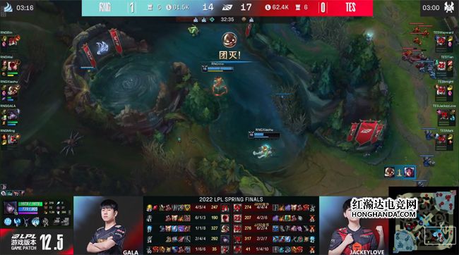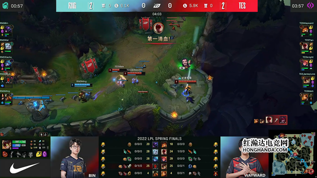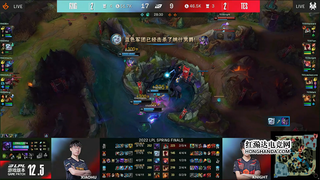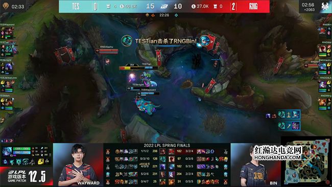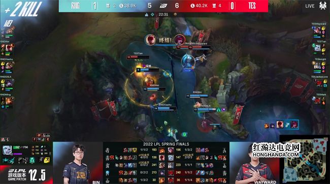 2022 LPL春季总决赛于4月23日下午如期开始,TES战队与RNG战队两队角逐银龙杯,两队在上一次交手时RNG以3-1的比分取胜,而TES战队在经历败者组决赛洗礼以后力克V5晋级春决舞台,誓要复仇RNG夺得联赛冠军!RNG战队开局状态出色,面对TES的猛攻采取防守反击战术,连下两城率先手握冠军点,然而TES也迅速调整了战术,继续贯彻进攻风格连追两局将比分扳平,但最终在决胜局里TES没能把握住前期优势,被顽强的RNG扭转局势。RNG 3-2战胜TES夺得队史第五次联赛冠军!