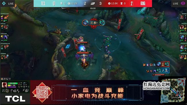 前期双方的火药味儿很浓,擅长进攻的TES先发制人,打出了不错的效果:下路组2级击杀了霞,蕾欧娜的引燃收获一血,同时TES中野入侵RNG的蓝buff野区,人马插翅难飞无奈倒地。