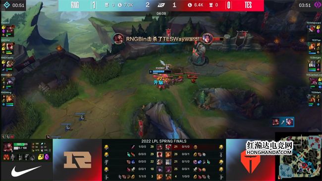 中期Xiaohu的飞机装备成型后poke伤害爆炸,做出破舰者的纳尔在单带时也完全不虚刀妹,TES只能放手一搏偷大龙,RNG赶来打出0换3接盘了大龙,TES中路也被通关。24分钟RNG埋伏在TES的蓝buff野区,想要抓单再控小龙,不料TES上野在中路牵制住了纳尔,同时泰坦在野区先手开到盲僧,RNG阵型分散被迫各自为战,TES得以抓住机会打出1换4,控下风龙稳住了局势。RNG唯一没有阵亡的飞机在下路单带时不慎遭到TES三人的围追堵截,把终结赏金送给了刀妹,TES果断rush掉大龙,RNG抢龙失败三人倒地,TES又夺回了节奏主动权。