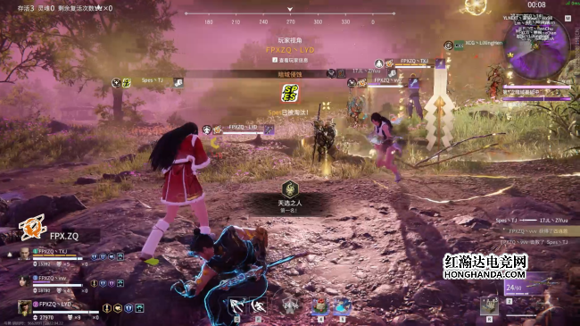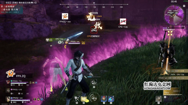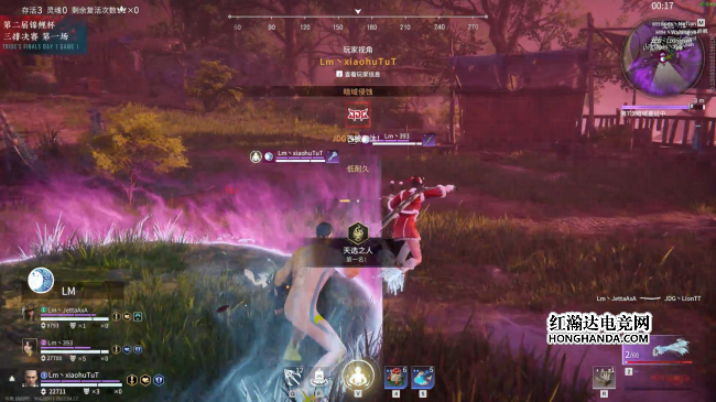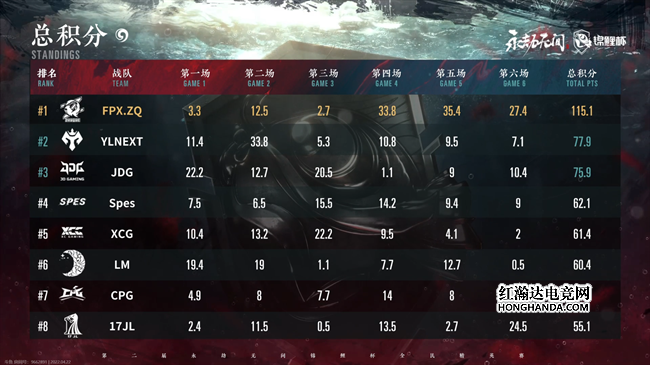 开局森罗谷WE宁红夜空降赤练无明给予HYH重创,让HYH购买的地煞符被迫用来救人。俗话说出来混迟早要还,正当WE跟别人打得火热时候,LF同样一发天降赤练无明,打得WE毫无办法。前期乱战过后GD、WBG、WE三支战队淘汰出局。中期17JL跟LF两支队伍进圈路线不佳,被围攻淘汰出局。第五次暗域蔓延,圈边战火不断,FPXZQ在乱战中,还能冷静的打出无尘V2斗转星移的“上菜”操作,瞬间重创Spes,随后如法炮制再斩CPG。随着圈进一步缩小,无尘V2“上菜”更加方便,一波精准传送一口气淘汰Ventus跟JDG在内的五名选手。三波奥义收割战场,FPXZQ主宰比赛!最终FPXZQ宁红夜开启赤练无明,满编击败Spes跟Ventus独狼后,两连斩获天选之人,单局拿下恐怖的35.4分。
