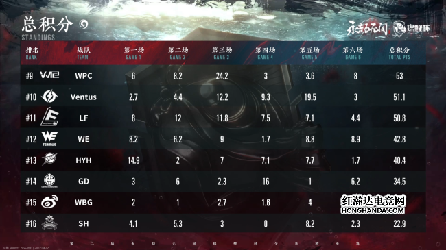 开局不舟滩GD精致配合将YLNEXT打入败者组,随后不舟滩乱战,各队宁红夜跟无尘奥义一个接一个,各凭本事争取击败分,WE跟HYH两支队伍从中获利最大。前期乱战过后GD跟WBG两支战队淘汰出局。首个飓风客争夺,FPXZQ跟抖音WPC血拼,抖音WPC抢到青龙之力顺势淘汰FPXZQ。中期WE被LF追杀团灭,第五次暗域蔓延,圈边开始激战,一波宁红夜大招浪潮过后,场上人数骤减。随着圈进一步缩小,JDG跟LM双变阵容开始发力。不过相比于JDG,LM在收割击败分的同时还能保持全员满编状态。最终LM满编击败JDG独狼后斩获天选之人,但JDG高风险高收益的打法让JDG拿到本局最高分22.2分。