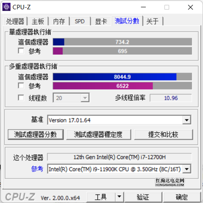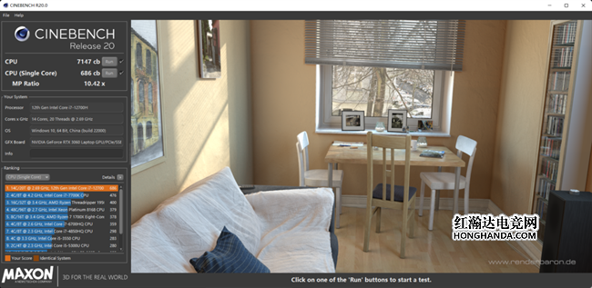 Intel i7 12700H在Cinebench R20测试中,单核成绩为686分,多核成绩为7147分,CPUZ测试中,单核成绩为734分,多核为8044分,其他的各项日常功能测试也都获得了亮眼的成绩。