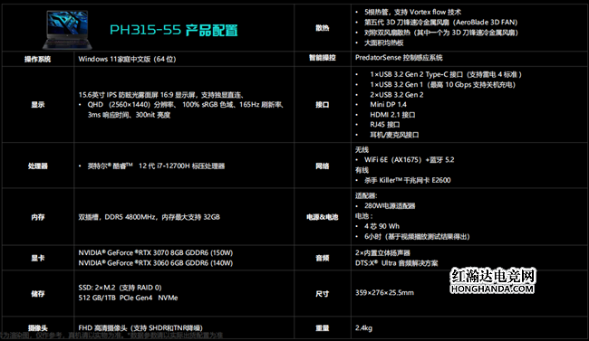 Acer掠夺者战斧300 2022游戏本A面/C面都采用了铝合金材料阳极氧化工艺,做工极其考究,配色为深渊黑显得神秘且低调,符合电竞游戏玩家的气质,15.6英寸2.5K分辨率IPS防眩光雾面屏,支持16:9显示,165Hz刷新率的电竞屏,16G DDR5 4800MHz内存,140w RTX3060显卡(同样也有150w 3070版本可选),整机重量为2.4Kg,搭载了Intel i7-12700H处理器,这代处理器最大的亮点是混合架构,代号为Alder Lake的架构拥有两种核心,一种是性能核P-core(6个),另一种是能效核E-core(8个),i7 -12700H处理器拥有14核心20线程规格,性能核最高睿频4.7Ghz,不论是纸面数据还是实际测试这一代的处理器从各方面都全面超越了上一代,也因此受到了用户们的热烈追捧。