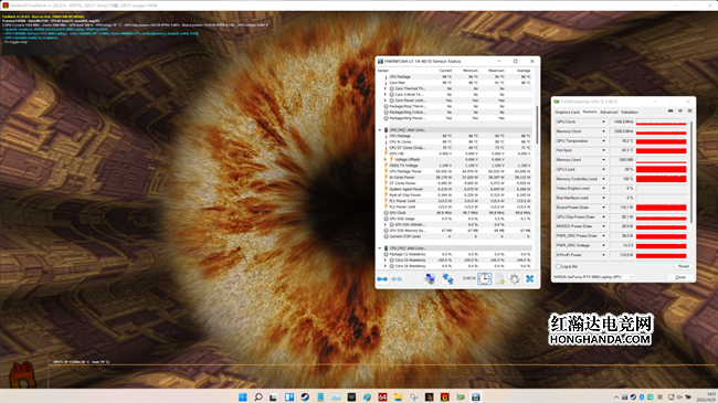 先来看看大家都比较关注的散热能力,我们使用AIDA64和Furmark分别对CPU与显卡进行烤机测试,CPU在单烤情况下能够达到108w的功耗,P-Core 3.9GHz,E-Core 3.2GHz,温度96度,单烤显卡时显卡功耗为120w,温度为72度。双烤时,CPU功耗为65w,温度平均88度,P-Core 3.2GHz,E-Core 2.7GHz,显卡功耗为115w,温度76度。在使用涡轮模式的情况下风扇噪音会比较大,日常使用推荐使用野兽模式就可以了,相比涡轮模式会安静很多。