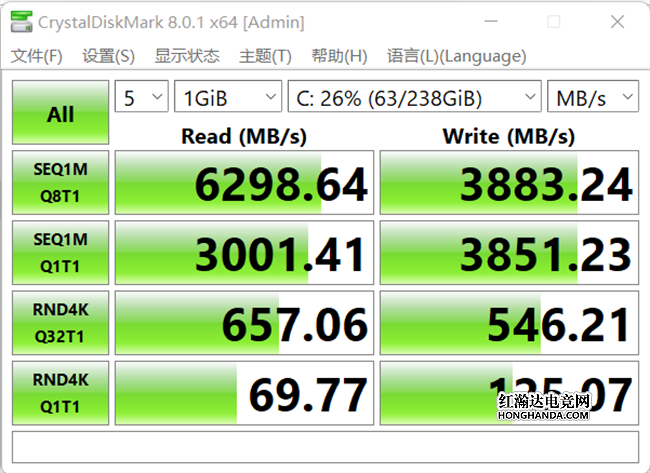 战斧300配备的固态为镁光3400,性能表现还不错,顺序读取速率达到了6298.64MB/s,随机读取速率达到了69.77MB/s,顺序写入速率达到了3883.24MB/s,随机写入速率125.07MB/s,可惜容量对游戏玩家来说有些不太够用,好在一共有2个m2固态位,可以自行扩容。