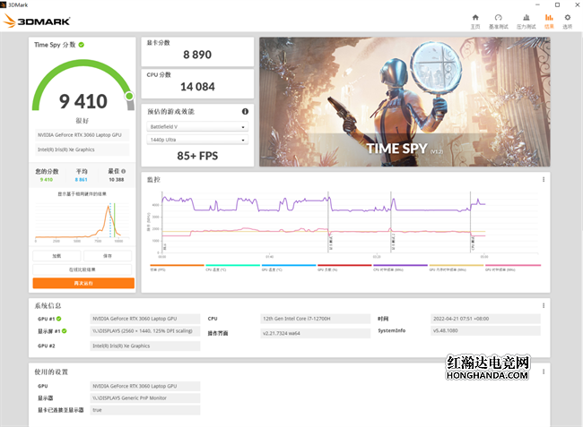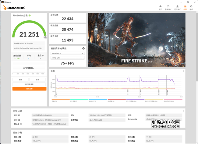 游戏性能基准我们使用3DMark FireStrike与TimeSpy进行测试,FireStrike分数为21251分,TimeSpy分数为9410分,可以看到2022版战斧300所搭载的i7-12700H在处理器性能上提升非常巨大,相比于上一代i7-11800H处理器,这颗CPU的分数有着大幅提高,FireStrike物理分提升25%,TimeSpy的CPU分数提升接近40%。