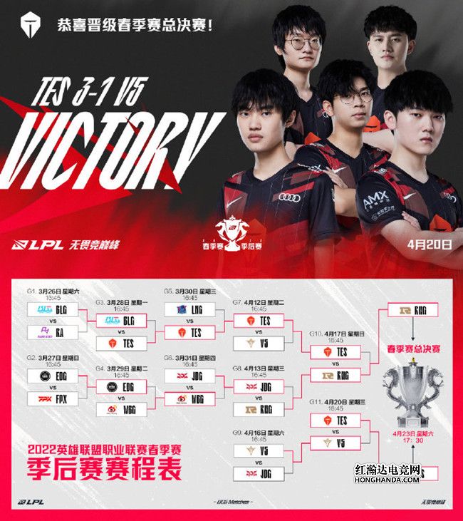 4月20日晚,在2022 LPL春季赛季后赛败者组决赛中,TES战队以3:1的比分击败V5战队,获得了晋级2022 LPL春季总决赛的资格。而在决赛等待着他们的对手是上一轮胜者组决赛的赢家RNG战队。两队将再度展开巅峰之战,角逐LPL春季赛总冠军以及银龙杯荣耀。两队之间最终的胜者将会登上整个赛区的顶峰,也将获得代表LPL赛区出征2022 MSI季中冠军赛的资格。想必这将会是一场精彩纷呈的强强对话。