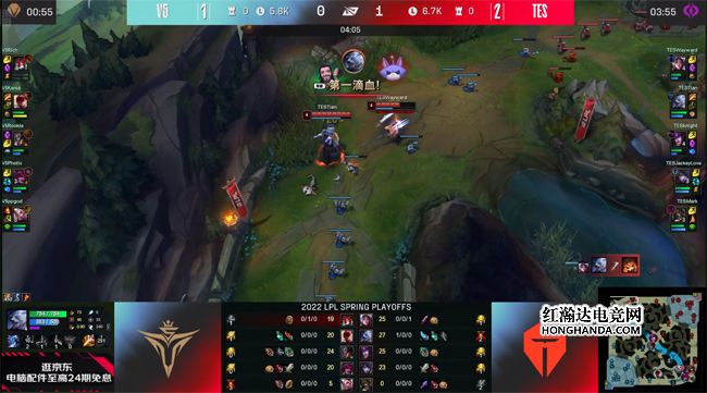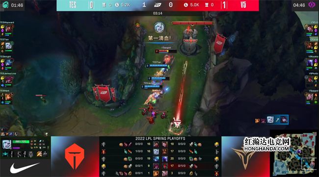 TES下路霞、洛组合开局相当激进,1级强势压线过了河道,泰坦2级钩中洛,厄斐琉斯补伤害打光了洛的血药,佛耶戈数次前来反蹲,掩护厄斐琉斯推线回城。5分钟V5中野双游下路,加里奥点爆炸果实弹到TES的红buff野区,和队友前后包夹留下了洛,佛耶戈W闪拿到一血,V5顺势控下海克斯小龙。