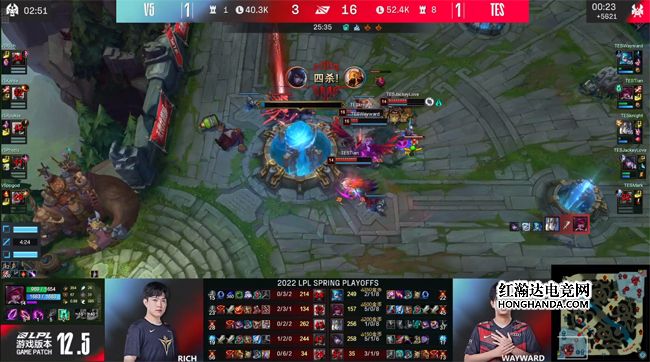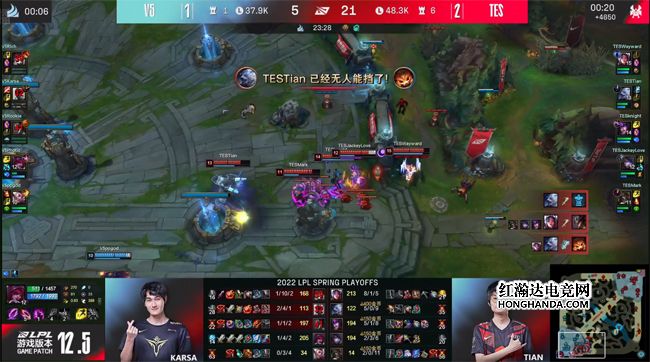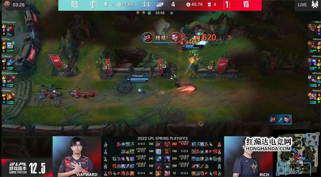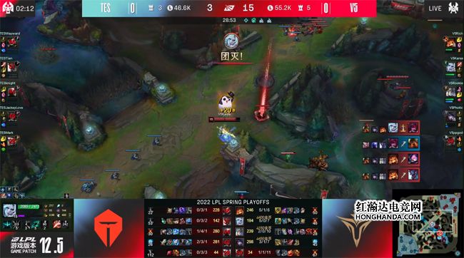 TES前期的“三板斧”一气呵成,没有给到V5反扑的机会,狗熊还控下了土龙,后续V5在峡谷先锋团战元气大伤:虽然大纳尔拍晕了TES四人,但烈娜塔在被拍晕之前放出了大招,导致V5第一时间没有跟上输出,TES一路拉扯到上路,打出1换4大获全胜!11分钟狗熊gank下路抓死了霞,同时Wayward的刀妹背靠上路一塔一打二怒砍双杀,V5上野双双阵亡,三路全面炸穿。TES无压力控下水龙,接连推掉V5两座边线的一塔。大龙出生前V5付出中路一塔的代价控到风龙,不过经济还是落后6千。