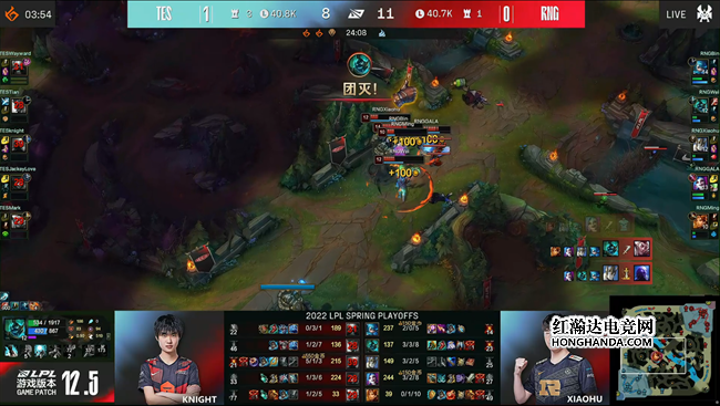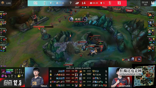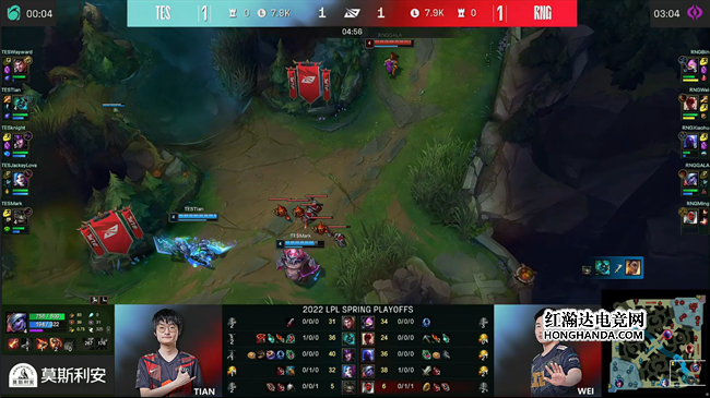 TES连续在团战中惨败,把前中期积累的优势已经完全葬送,唯一的慰藉就是远古龙魂没有落到RNG手中,双方回到同一起跑线,有酒桶璐璐保护的厄斐琉斯输出能力非常恐怖。TES想要通过上中的分推分散RNG的注意力,但他们在分推和正面两端都没有打赢RNG,RNG拿下第三条大龙以后在远古巨龙处完美拉扯将TES逐个击破完成了惊天翻盘结束比赛,恭喜RNG 3-1战胜TES挺进2022 LPL春季总决赛!