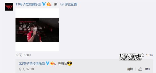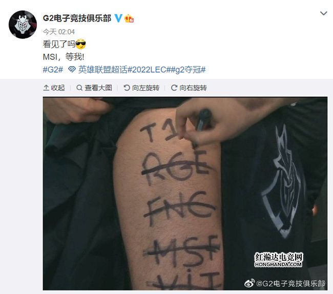 有趣的是G2在夺冠后现场“整活”,直接向T1下了MSI“战书”:G2的“气氛组”工作人员展示了写在自己大腿上的队伍名单,G2的手下败将VIT、MSF、FNC、RGE都已经被划掉,最上面就是G2的下一个“猎物”T1~而T1官博也在G2官博的评论区放出了“小吕布”Gumayusi的赛后动图作为回应,这波隔空互动也被网友们调侃“双向奔赴了属于是”~
