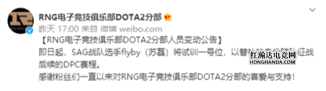 昨日,RNG电子竞技俱乐部DOTA2分部发布微博,SAG战队选手flyby将试训一号位,以替补身份征战后续DPC赛程。原队内一号位链子哥应该是无了。