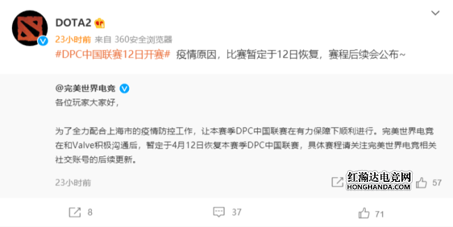 为了全力配合上海市的疫情防控工作,让本赛季DPC中国联赛在有力保障下顺利进行。完美世界电竞在和Valve积极沟通后,暂定于4月12日恢复本赛季DPC中国联赛,具体赛程请关注完美世界电竞相关社交账号的后续更新。