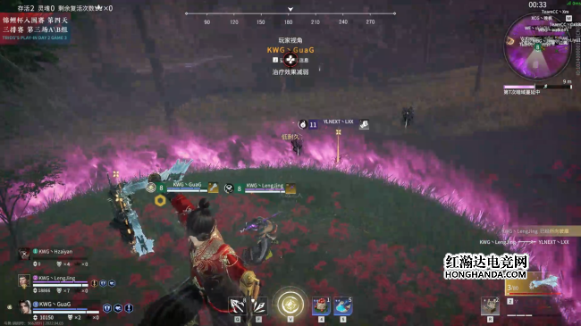 第三局开局主战场回到落日寺,TC打得有些上头,开局掉入败者就近返魂,为他们莽撞付出代价结果早早淘汰赛出局。战场由寺内打到寺外,YLNEXT乱战中收割击败分,并用无尘奥义拉扯,拿到10个击败分还保持满编存活,成落日寺一役最大赢家。第三次暗域蔓延圈边频繁交手YZG惨遭围攻淘汰出局。随着圈缩小来到树林地形,这里宁红夜非常好发挥,TeamCC丶Cx330天降宁红夜全场眩晕,却为GA做嫁衣,让GA拿到不少击败分。决赛圈各队宁红夜不断释放奥义,而KWG每次可以完美规避,最终KWG两兄弟合力击败YLNEXT丶LXX后斩获天选之人。KWG依靠这局出色发挥拿到25.8分,让他们排名往前跃进一步。