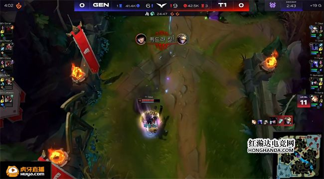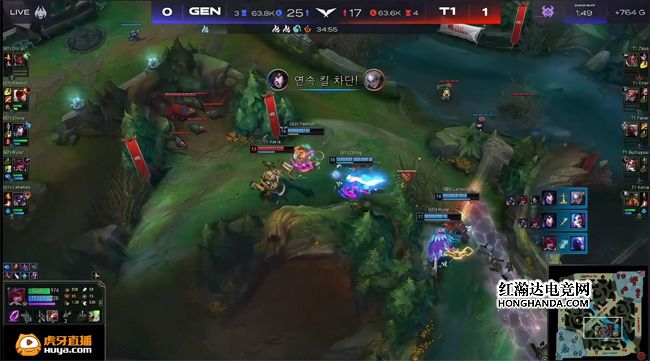 阿克尚不但没有打出预期的效果,而且还成了T1的“军训”目标,雪上加霜的是盲僧的节奏也被阿克尚带崩,T1上中野的节奏全面起飞,佛耶戈放出峡谷先锋帮助凯南单吃了上路一血塔,GEN上野都是0/2节奏炸穿,Chovy的瑞兹进野区打蓝buff时也被T1中野辅抓死,盲僧只能控下火龙勉强止损。GEN唯一的优势点只剩下路,霞对线推掉T1的一塔,悠米开大留下金克丝,帮助霞拿到人头,不过T1在中路打出0换2拆了一塔,GEN中野再度阵亡。16分钟凯南在下路一打二完全不虚,瞬间融化了阿克尚和悠米。