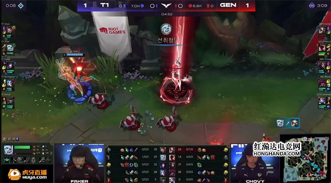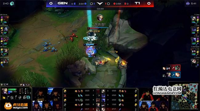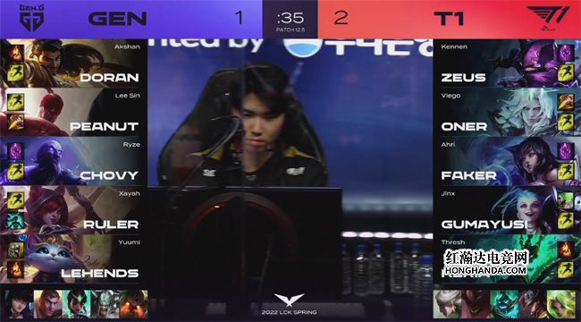 大龙出生前T1上、中卖自己掩护梦魇控下火龙,GEN打出0换2还能接受,两队经济完全一致。中期T1的决策思路和果断的执行力完胜GEN:两队在小龙河道拉扯时青钢影绕后单切维克托,T1发现青钢影脱节不再恋战,而是趁机rush掉火龙。GEN带走了青钢影直扑大龙,T1四人迅速回城补状态,瑞兹“开车”带队友赶到大龙坑,GEN惩下大龙后被各个击破,Gumayusi的女警斩获四杀,T1团灭GEN大获全胜,通关了中路高地塔,经济领先7千。最终GEN在小龙河道放手一搏,狗熊拼惩戒没有抢到火龙,维克托开完金身被女警的夹子留下直接“白给”,T1摧枯拉朽打出0换5团灭GEN,1-0先下一城!