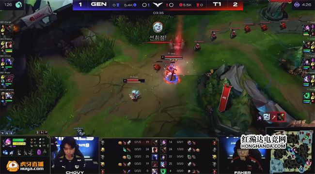 向来以运营稳健而著称的GEN开局一反常态,展示出了十分强势的进攻性:双方下路组几乎同时抢到了2级,EZ抢先拿到拉克丝的一血,女警也击杀了卡尔玛。Peanut的狗熊3级直接抓中,瑞兹遭到GEN中野包夹无路可逃,狗熊拿到人头。