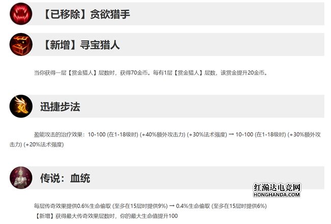 盈能攻击的治疗效果:10-100 (在1-18级时) (+40%额外攻击力) (+30%法术强度) → 10-100 (在1-18级时) (+30%额外攻击力) (+20%法术强度)