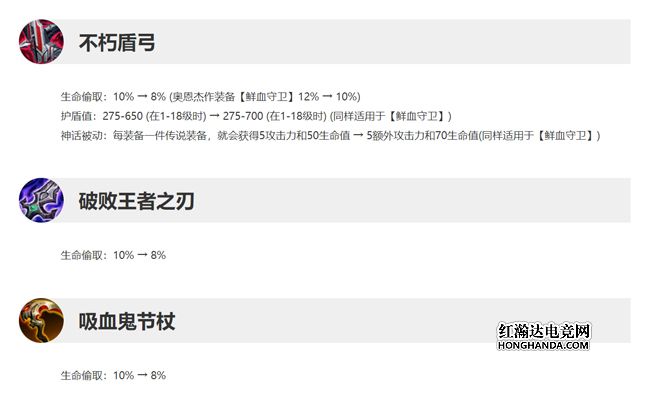 神话被动:每装备一件传说装备,就会获得5攻击力和50生命值 → 5额外攻击力和70生命值(同样适用于【鲜血守卫】)