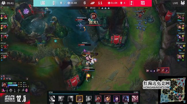 大龙出生前TES众人在野区掩护阿狸打蓝导致中门大开,LNG趁机放出先锋推掉一塔,又抓住TES回防二塔的时间差rush掉海克斯小龙,TES抱团反推中一塔,付出酒桶和厄斐琉斯的代价才终结了瑞兹,LNG打出1换2守住了一塔。TES重整旗鼓再度推中,酒桶精准的大招炸回巨魔,TES突然发难打出0换2,转身收下大龙。25分钟TES携带大龙buff兵线拆了中路二塔,两队在LNG红buff野区遭遇,没有大招的烈娜塔对LNG的威胁极其有限,杰斯侧翼的加强炮帮助金克丝融化了TES后排,LNG打出1换5团灭TES大获全胜!