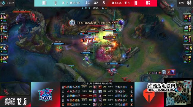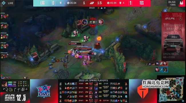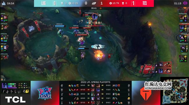 TES目送LNG“听牌”了海克斯龙魂,复活后抱团进入上半野区,尝试做大龙坑的视野,LNG急于让TES减员从而开打龙,Doinb的瑞兹隔墙的E技能弹到了厄斐琉斯,冒进闪现EW禁锢厄斐琉斯,可是自己和队友脱节,反而被集火反杀,TES一鼓作气各个击破,打出0换5团灭LNG拿到大龙,又夺回了节奏主动权。最终两队在小龙河道展开决战,LNG解锁了龙魂后被酒桶的大招炸散了阵型,同时阿狸绕后打残金克丝,TES前后包夹打出1换3,平推中路一波结束比赛,有惊无险1-0先下一城!