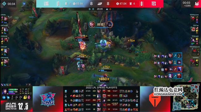 梦魇升到6级后给到LNG边线莫大的压力,石头人直接卡兵线,甚至还不给杰斯蹭经验,梦魇开大抓中击杀了卡尔玛后杰斯才敢过河道补兵,梦魇去下路放峡谷先锋之前顺手控下风龙,厄斐琉斯单吃了LNG下路一血塔发育起飞,TES迅速换线提速,掩护梦魇兵不血刃拿到第二只先锋。17分钟阿狸单吃了上路一塔,厄斐琉斯在中路一套技能打出金克丝的闪现,金克丝被迫回城补状态,LNG只能放掉中路一塔。大龙出生前LNG付出上、下路三人的代价才拆了上路一塔,TES“听牌”海克斯龙魂,经济领先5千。
