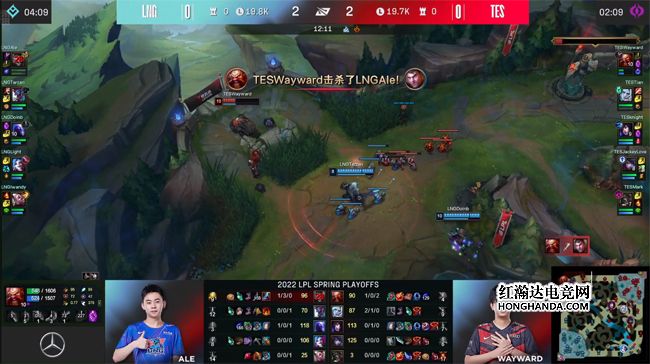 前期TES中、下路两路手握线权,佛耶戈得以控下风龙,然后在酒桶闪现转好后再次抓上,杰斯禁不住炮车的“诱惑”,出塔补车时被酒桶E闪R炸到了佛耶戈脸上再度阵亡,不过随后佛耶戈偷峡谷先锋时被发现,LNG上中野先行完成集结,巨魔抢到了先锋,佛耶戈被瑞兹终结,阿狸逃回中路一塔,不料洛开大赶来,瑞兹收获双杀稳住了LNG的节奏。12分钟Wayward的酒桶凭借天秀“几何桶”的操作单杀了Ale的杰斯,LNG中野赶到收掉酒桶,瑞兹单吃了上路一血塔作为止损,厄斐琉斯也单吃了LNG下路一塔。