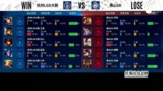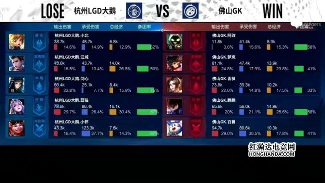 11分钟,双方换龙,露娜拿下暴君,澜拿下暗影主宰,12分钟,西施一技能拉中不知火舞,不知火舞倒地,15分13秒,露娜拿下暗影暴君,15分45秒,澜蹲草大招杀出配合太乙真人闪炸,澜直接咬死狄仁杰,澜拿下暗影主宰,17分40秒,猪八戒+露娜秒掉李元芳,太乙真人复活给慢。18分半,澜蹲草大招推四人怒切双C二连击破,19分钟,澜杀到敌方高地再拿双杀,露娜断大被澜带走,澜伪五杀团灭LGD,GK推掉敌方水晶,战胜LGD。本局最佳给到佛山GK.鹏鹏的澜