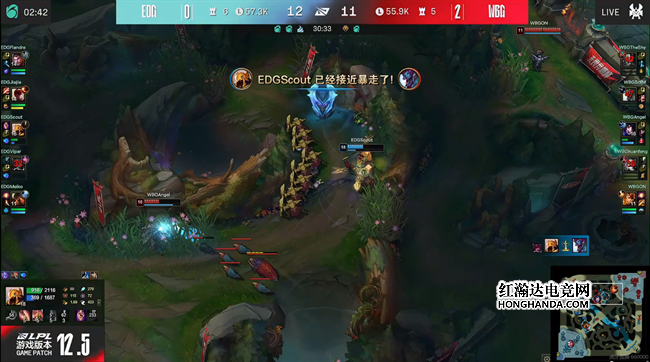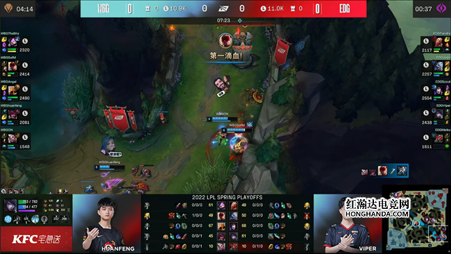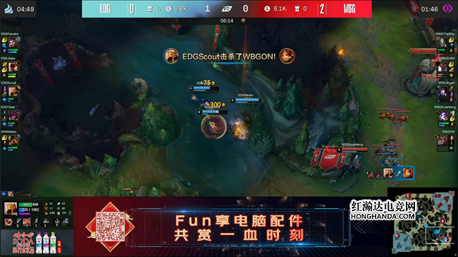 两边辅助同时从河道向中路附近游走,占据视野优势的EDG率先发难,锤石钩中了曙光,曙光向中路一路逃跑,双方牵一发而动全身在中路集结了几乎所有兵力,最终曙光和锤石互换了人头。接下来佛耶戈抓住曙光没闪的时机在下路发起Gank将其击杀。几分钟过后曙光游走到上路想要蹲伏接通,但卡牌的支援非常迅速,两边最终还是上单进行了1换1。先锋落入了EDG之手,WBG双人组在三角草丛主动进攻换血,却因为技能配合失误导致霞被击杀。