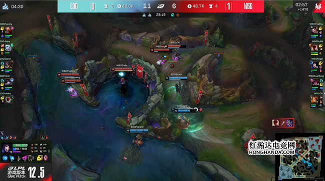 双方逐渐打上了头,开始疯狂爆发团战,WBG推进中路被EDG从后方逼迫进入了对方野区,人马和塞拉斯在侧翼强行先手击杀了泰坦,反而让霞和劫有了打满输出的机会,两人在酒桶的控制辅助下完成了收割任务,WBG这波3换4战胜EDG,劫砍下三杀。EDG痛定思痛复活来到中路,终于在侧翼发现了酒桶并且五人上前集火,没想到酒桶顶住了五人的输出,金身规避致命伤害以后闪现丝血逃脱!WBG大部队得以输出拉满再度将EDG击溃。