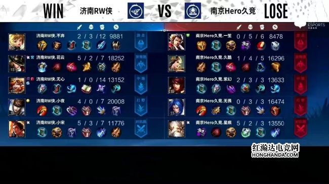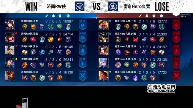 17分半,马可波罗一三技能瞬秒张飞,Hero再掉下路高地,19分钟,赵云拿下暗影主宰,孙膑大招沉默两人,赵云扎死无闪现的周瑜,19分半,RW侠冲敌方中路高地失败,张飞大招吼中三人,老夫子无限敲带走吕布和马可波罗,20分半,虞姬拿下风暴龙王,老夫子捆中孙膑,孙膑被卖倒地,22分钟,赵云扎到橘右京,橘右京掉复活甲后被吕布守尸击杀,赵云二度进场扎死虞姬,周瑜铺火铺满扭转战局,Hero打出二换三,22分半,满血赵云拿到双杀,周瑜临死烧掉RW侠中路高地,23分半,Hero三路高地被破,张飞开加速逼团,老夫子大闪捆中吕布,吕布反手跳大大招跳三人,马可波罗转大瞬秒老夫子,无心沈梦溪闪现二一击杀周瑜,赵云再扎两人带走虞姬,Hero五人逐一倒地被团灭,RW侠推掉敌方水晶,来到赛点局。本局最佳给到济南RW侠.小宋的吕布