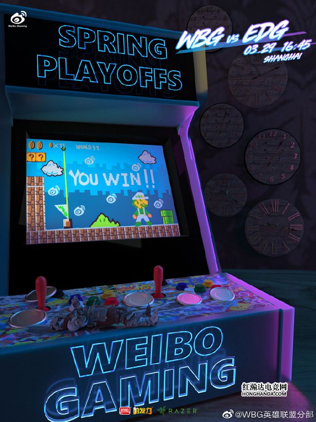 WBG的海报标题是“完美时机”,游戏机屏幕上显示的是已经通关获胜的WBG“马里奥”,WBG的队标既是马里奥得分的道具,也是游戏机操作台上的游戏币,EDG的骑士玩偶倒在了桌面上,右侧墙壁上挂着6个表盘,暗示今晚WBG会以时机完美的团战击败EDG。