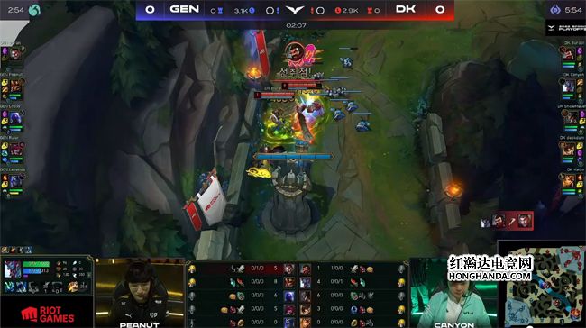 前期Canyon的豹女展现出了教科书级别的反野能力,Peanut的人马在前5分钟只拿了一个红buff、一只河道迅捷蟹和一组幻影狼,豹女将GEN野区的其他资源洗劫一空,配合中辅拿到人马的一血,阿狸也随之倒地,导致GEN中野前期节奏大爆炸。