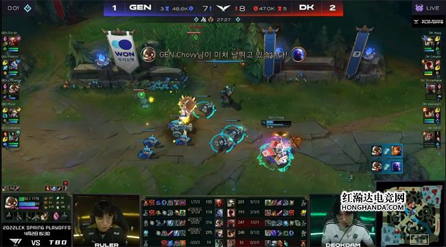 北京时间3月27日,LCK春季赛半决赛的第二场较量由常规赛第二名GEN对阵第三名DK!双方鏖战打满了五局,Chovy的飞机在GEN 1-2落后时顶住了压力,第四局对位领先ShowMaker瑞兹4千经济并砍下7/0的华丽数据,决胜局GEN在落后一万经济的绝境下完成了逆天翻盘,最终3-2淘汰DK,同T1会师4月2日的决赛!