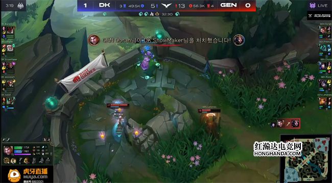 3分钟蕾欧娜E到卡尔玛挂引燃,卡莎的伤害被卡尔玛的RE加强盾规避,反而被EZ拿到一血。前期GEN凭借中路对线的辐射优势主打上中野,DK下路组则一直推线吃镀层,佛耶戈连续控下两条小龙,EZ很快就单吃了GEN下路一血塔。虽然Burdol的石头人只能在塔下吃兵,但先于Doran的杰斯升到10级,看到杰斯蓝量见底后果断QR击飞杰斯,追进河道完成对位单杀!大龙出生前杰斯在中路清兵时很随意地交了锤形态Q补兵,DK双C果断突袭追击,EZ的大招将其带走,减员的GEN无奈目送DK“听牌”水龙魂。