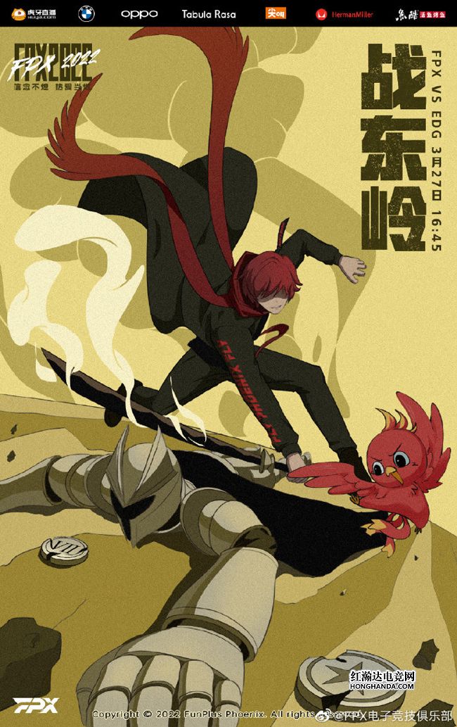 FPX的海报标题为“战东岭”,EDG骑士被打倒在地,即将化作小凤凰少年的“刀下忘魂”。本赛季的FPX经历了打野、中单两个位置的轮换,在赛季后半段才确定了Clid加新人小将Care的组合,不论队伍磨合、Care稚嫩的赛场经验还是牛排糟糕的BP,都让“巴黎人”们为艰难搭上季后赛末班车的FPX捏了一把汗,雪上加霜的是FPX在常规赛0-2不敌EDG,Jiejie从Clid手中怒抢大龙完成了翻盘,使得FPX对上EDG的胜率更加渺茫,不知哪支S赛冠军会遭遇“一轮游”遗憾出局呢?