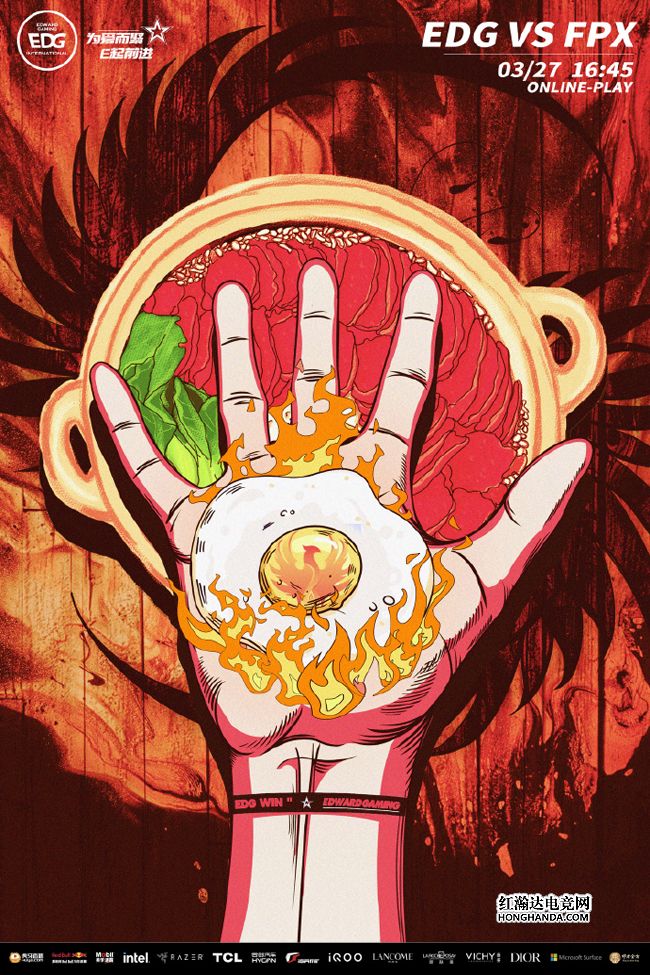 EDG的海报标题是“炮凤烹龙”,小骑士的肥牛砂锅已经做好,只差一颗煎蛋就可以开动,EDG骑士直接整了一出手心摊蛋的绝活儿,蛋黄中的凤凰图案暗示今晚FPX将成为EDG庆祝胜利的“下酒菜”。虽然S11冠军要从季后赛第一轮开打有点出乎各界的预料,但EDG所在的半区有S9冠军FPX、S10亚军WBG和六连胜收官常规赛的2020年LPL春冠JDG,想要晋级四强拿到“复活甲”绝非易事,仍然有概率出现爆冷的情况,期待EDG季后赛首秀的发挥。