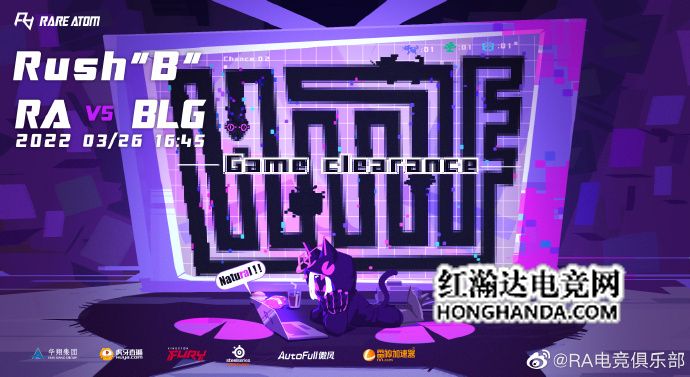 RA的海报标题为“Rush ‘B’”,RA稀有原子小精灵正趴在地毯上惬意地玩着“贪吃蛇”,墙上的投屏影像显示RA操纵的巨蛇已经占据了整个游戏画面,电脑也发出了“Natural”(天赋异禀)的称赞,其中“ra”被标为紫色,正是RARE ATOM的队名简称,不知RA一众天赋拉满的年轻小将们能否淘汰BLG呢?