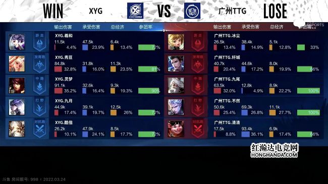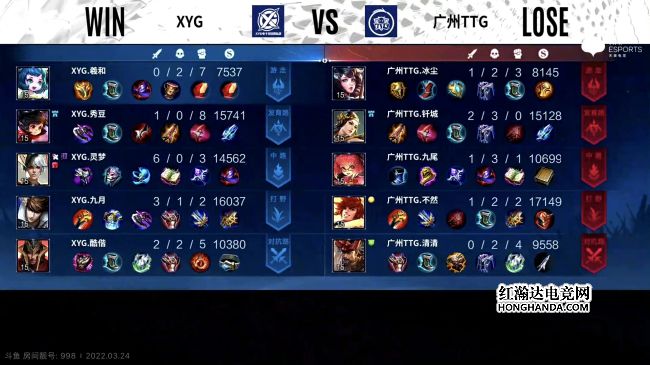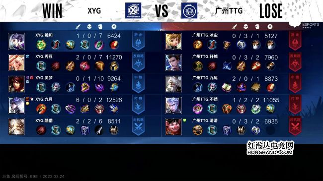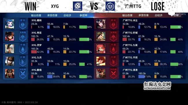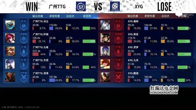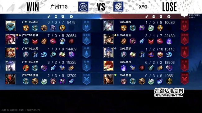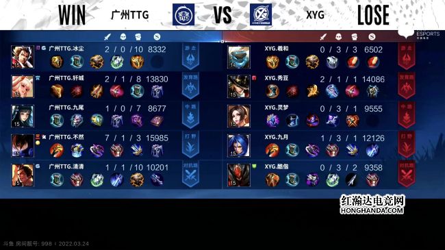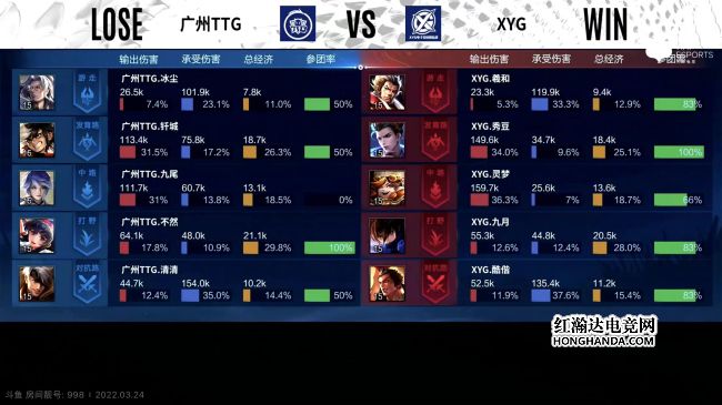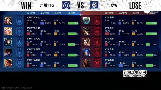2022年KPL春季赛常规赛第二轮第四周第二个比赛日第一场比赛由广州TTG对阵XYG,这是一场S组的比赛,广州TTG1胜3负,XYG1胜2负,上一轮XYG零封了广州TTG。最终,XYG三比二战胜广州TTG,XYG晋级季后赛。