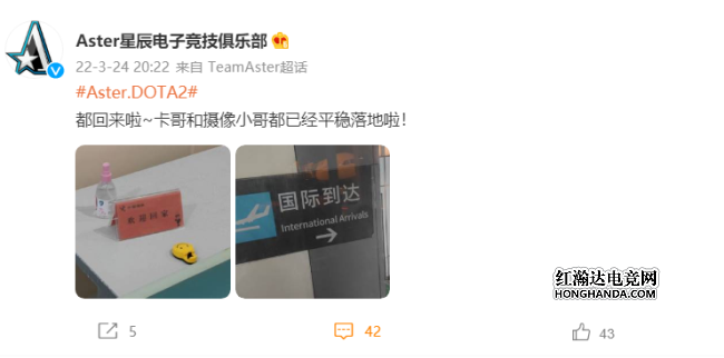 自从TI10期间,Aster队员不幸感染新冠,导致后续一系列事情。TI结束后,Aster队员也一直无法回国团聚,就连比赛都是线上形势各自为战。今天Aster官博发出喜讯——“都回来啦!”