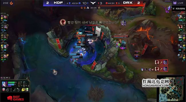 中期Zeka的卡牌埋伏在KDF的红buff野区通,一发火炮黄牌留下女枪,DRX得以打出0换3。陷入劣势的KDF转入全面防守,三路二塔陆续告破,顶住压力在自家野区打出一波漂亮的1换3,可是经济还是落后7千。两队三C的操作拉满,在中路和野区频繁poke有来有回。37分钟Deft的霞在中路清线时不慎吃到佐伊的催眠气泡,KDF集火将其秒杀,开大龙遭到干扰后转而尝试解锁龙魂,卡牌再次传送绕后,卡视野的黄牌命中了女枪,霞复活参战后DRX以突如其来的1换5团灭KDF一波结束比赛,1-1艰难地扳平了比分!